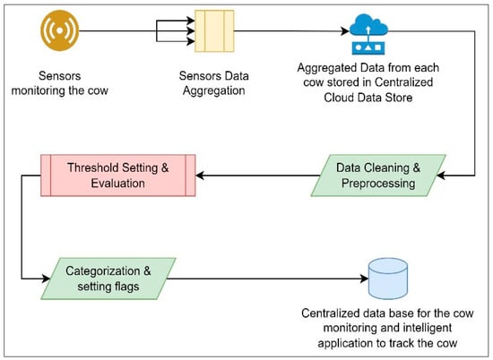 The proposed model is depicted in Figure 1. The model processes the data from the sensors employed in the cow helps gather data; the data from the sensors is then aggregated and stored in a centralised shared database that can handle data on a large scale. The data is then updated with the appropriate clearing, processing, and pre-processing steps to make it convenient for future applications. The data then passes through a threshold setting and evaluation mechanism that has been seen by the experts and veterinarians who asses the cattle and give the required changes in the parameters and thresholds. Based on the mechanisms, threshold flags will be generated to help the farmers and farm managers attend to that cattle and provide the required support in addressing the change observed concerning the parameters. The processed and labelled data is then stored in another database for processing and informed decision-making.
