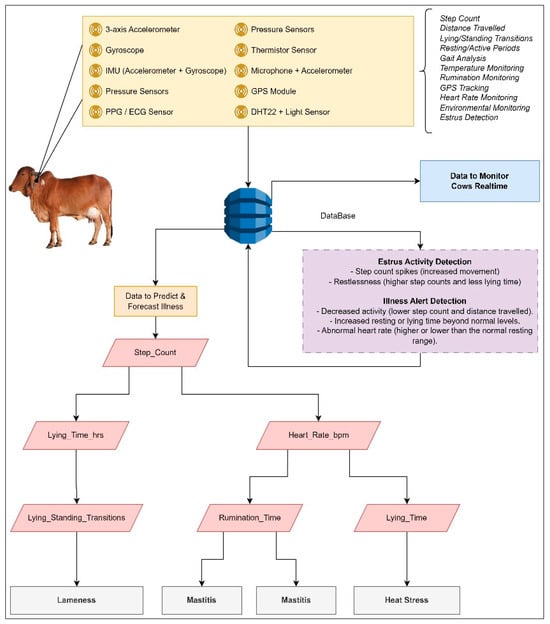 Diseases are common for livestock; various diseases occur in them, and these can be observed with minor changes in the health parameters of the animals. Lameness, characterised by reduced mobility and increased resting periods, is a major welfare issue in dairy cows, causing significant economic losses due to reduced milk yield and fertility. Studies have shown that monitoring lying time and step count can effectively indicate lameness [4]. Similarly, mastitis, an inflammatory udder condition, can be identified by monitoring deviations in heart rate, rumination activity, and physical movement [5]. Issues including heat stress, which negatively impacts productivity and reproduction in cows, can be detected by tracking variations in heart rate and lying time [6].