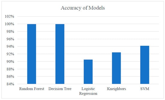 RF and DT models achieved an accuracy of 100%, demonstrating robustness in identifying and learning from the complex patterns within the dataset. These models could successfully capture non-linear relationships and interactions between multiple health parameters of the cow, which includes step count, lying time, heart rate, and rumination activity. The high accuracy of these models is attributed to their ability to perform feature selection and ensemble learning, which reduced the risk of overfitting and improved generalizability.