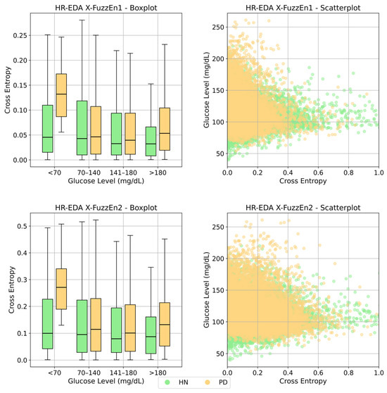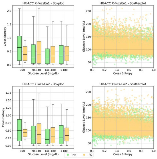 In contrast, the cross-entropy analysis for HR–ACC coupling did not reveal any significant differences between the HN and PD groups across any of the four glucose ranges (Figure 4).