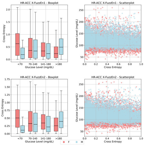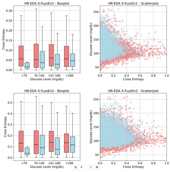 A similar divergence was observed between sex groups (Figure 2). In the hypoglycemia range, male subjects exhibited lower HR–EDA cross-entropy compared to female subjects. For X-FuzzEn1, the median cross-entropy for males is 0.02, with a narrow IQR between 0.01 and 0.04. In contrast, females had a median of 0.06, with a broader IQR extending up from 0.02–0.12. Similarly, in X-FuzzEn2, the male median remains at 0.04, while the female median rises to 0.13, with the IQR spanning from 0.05 to above 0.24. Across the normoglycemia, elevated normoglycemia, and hyperglycemia ranges, male and female HR–EDA cross-entropy values appear more aligned, with males consistently showing slightly lower or equivalent medians and IQRs. These patterns suggest that males may maintain more stable autonomic regulation in response to hypoglycemia, as reflected in the lower entropy between HR and EDA.