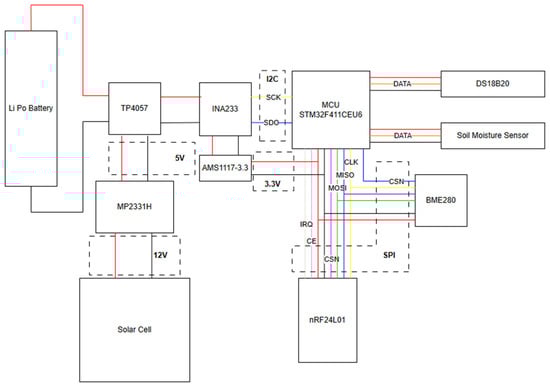 For the interconnection between components and integrated circuits, several protocols will be used. The nRF24L01 radio-frequency module, manufactured by Nordic Semiconductor (Trondheim, Norway), operates exclusively through the SPI protocol. The BME280 sensor, manufactured by Bosch Sensortec (Reutlingen, Alemanha), supports both SPI and I2C, depending on its electrical configuration; however, SPI will be used to achieve higher data transfer rates. The external soil temperature and moisture sensors, DS18B20 and the Soil Moisture Sensor, communicate exclusively through the 1-Wire protocol. The INA233 uses the I2C protocol for parameter reading and configuration.