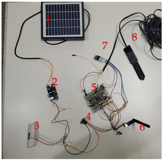 After a brief overall review of the sensors and modules to be used in the project, one essential point remains. To be characterized as an embedded module, the capability for self-power supply is crucial. First, it is necessary to consider the existing technologies to calculate the maximum current consumption based on the information provided in manufacturers’ datasheets. According to Table 2, it can be inferred that proper circuit operation requires at least 50 mA of current. To meet this demand, a polycrystalline silicon photovoltaic panel with 12 V and 5 W power rating will be used, providing an operating current of approximately 166 mA—more than sufficient to power the module.