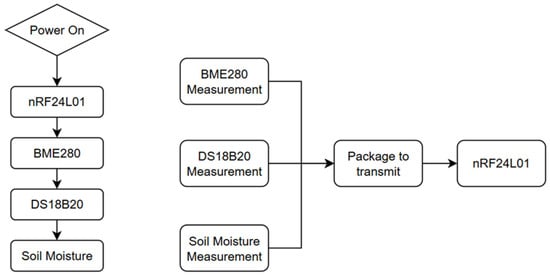 It is possible to observe in Figure 3 the basic operational flow for data collection, processing, and transmission by the systems. On the left side, during module initialization, the components are configured in the following order: initialization and configuration of the nRF24L01, setting its registers with the transmission address in the data pipes used, transmission power, enabling dynamic payload length, and activating the Enhanced ShockBurst protocol. For the BME280, in order to reduce power consumption, the weather monitoring configuration recommended by the manufacturer was used. The IIR filter was disabled because the agricultural environment where the sensor operates does not present significant fluctuations in the measured parameters, making smoothing unnecessary. Regarding the DS18B20, its configuration does not require register settings; it only requires specifying the pin to which it is connected. Its communication and activation occur exclusively through precisely timed pulses, as defined in its datasheet. Similarly, the Soil Moisture Sensor does not require external configuration and outputs an analog voltage when powered on, which can be calibrated to represent the relative soil moisture.