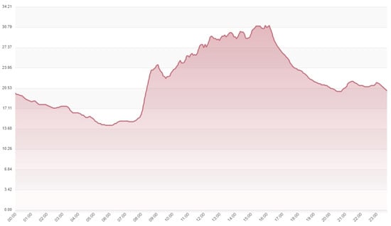 In addition, Figure 5 below presents a graph of soil temperature data collected from the DS18B20 sensor. The measurements were carried out simultaneously with the BME280 data collection test. It can be observed that the DS18B20 indicated higher temperatures, which can be attributed to the greater thermal retention capacity of the soil.