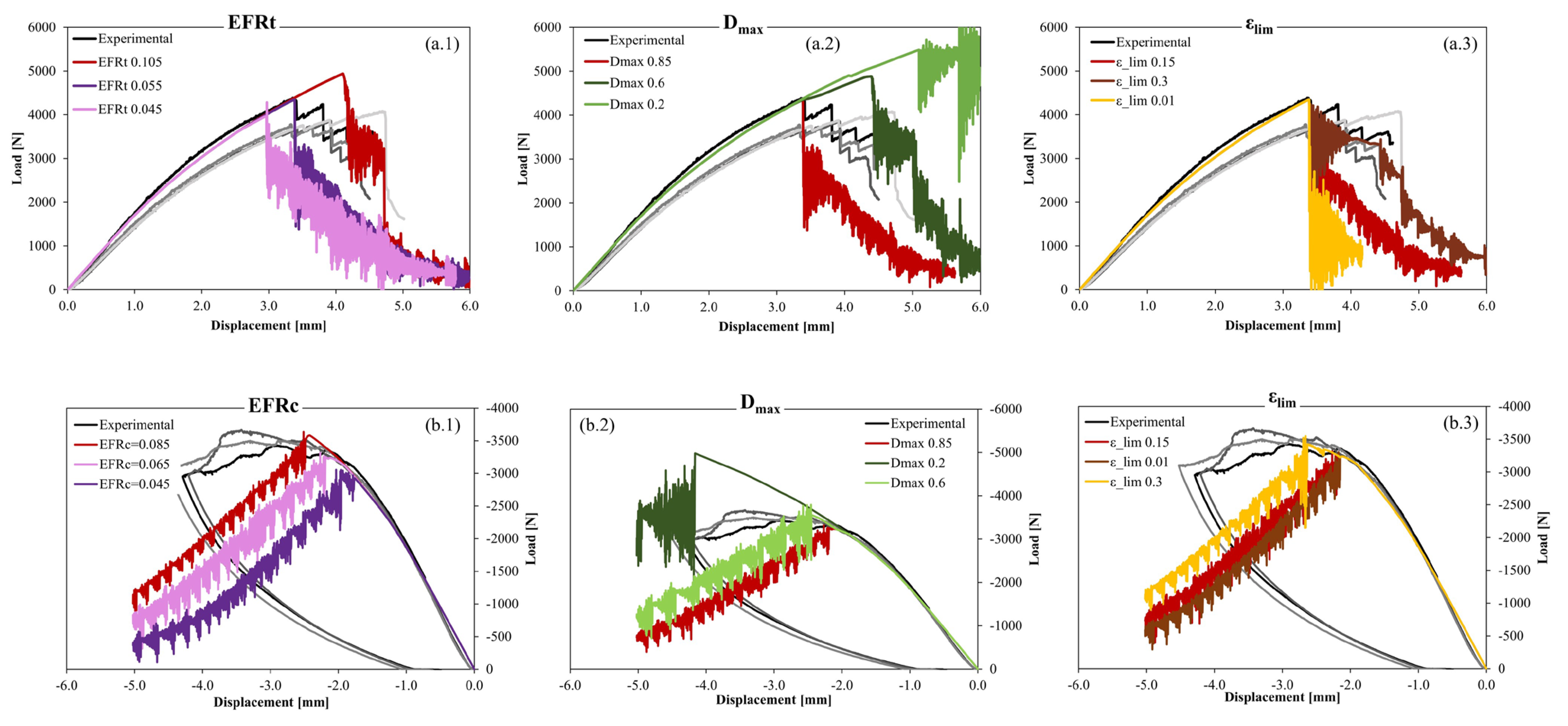 - From the CT and CC tests, the fibre fracture energies (EFRt for the tensile and EFRc for the compressive energies) are calculated and applied to the model.