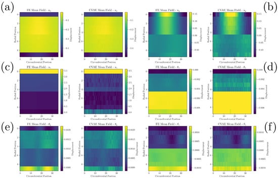Contour plots of the mean fields for (a) , (b) , (c) , (d) , (e) , and (f) predicted by the FE model (left) and the surrogate (right) on the test set. All units in mm.