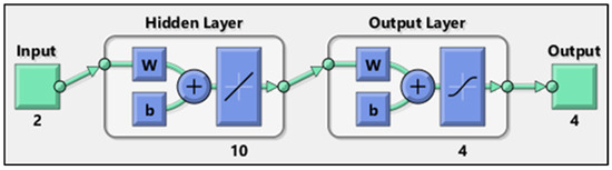 The dataset was randomly divided into training (70%, 15 tests), validation (15%, 3 tests), and testing (15%, 3 tests) subsets. The chosen architecture was a 2–10–4 structure, with two input neurons (laser power and scan speed), one hidden layer with 10 neurons, and four output neurons; YS, UTS, ε%, and E (Figure 1). A tan-sigmoid activation function was used in the hidden layer, and training was performed in MATLAB® R2013b using the Levenberg–Marquardt backpropagation algorithm.