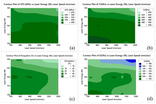 Contour plots showing the effect of laser power and scan speed: (a) on UTS; (b) on YS; (c) on ε% and (d) on E.