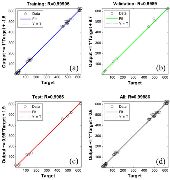 The training process, shown in Figure 3, demonstrates rapid convergence with the best validation performance achieved at epoch 11. The corresponding regression plots (Figure 4) highlight the strong correlation between predicted and experimental values. Correlation coefficients were R = 0.9990 (training), R = 0.9989 (validation), R = 0.9985 (testing), and R = 0.9989 (overall), confirming the robustness and generalization ability of the model.