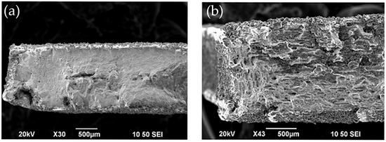 SEM fractographies of specimens fabricated at 150 W: (a) specimen A1 (800 mm/s) showing ductile fracture morphology; (b) specimen A9 (1200 mm/s) showing brittle fracture with unmelted particles.