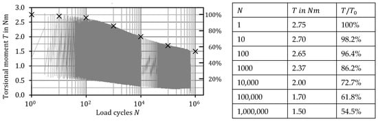 The geometry of the thin GFRP reference tapes was specified according to DIN EN ISO 527-5 [15]. All tapes have a total length of . The width is and the thickness (). Additional veneers were glued to both sides of the specimen ends to prevent fractures in the clamping devices. The free test length is therefore reduced to . The tapes consist of four layers of glass fiber-reinforced epoxy resin (GFRP) with fibers oriented at ±45° to the longitudinal axis, manufactured using a vacuum-assisted process and cured at 60 °C. The institute has a special testing machine for cyclic torsion of spring steel wires, which was used for the tests. All fatigue tests were conducted for free torsion (). Due to the application, which is comparable to helical compression springs, fatigue tests must be conducted with a controlled angle of twist, analogous to fixed spring lengths. This reduces the torsional moment over time due to small amounts of damage in the composite. Figure 1, left, shows the torsional moment as a function of the number of cycles for a tape specimen. It is known from publications that, analytically speaking, the torsional moment is linearly related to the stiffness from the ABD matrix. Thus, the laminate properties can be directly inferred from the torsional moment.