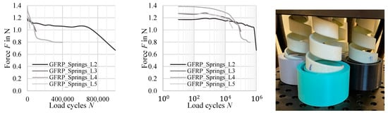 The second series of tests was conducted using GFRP volute springs. The springs were manufactured with a large coil spacing to eliminate coil contact. This required the springs to be placed in special spring plates, as shown in Figure 2. During the test, the spring force is continuously recorded as the sum of all four springs. This allows a direct determination of the average force as a function of the number of cycles. This method requires considerably less testing and measurement effort than with individual force measurements, but spring failure can only be directly recorded and assigned to a limited extent. For example, the force curve at length L2 decreases quite steadily, whereas at L3–L5 (longer deflection range, same mean deflection for all springs) a significant drop in force occurs within 100,000 load cycles.