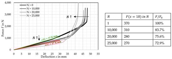 The curve was recorded before the test and for , , and load cycles (Figure 3). The usable spring deflection decreases with continued load cycles, meaning that the initial length shortens. Furthermore, the spring rate decreases, from to .