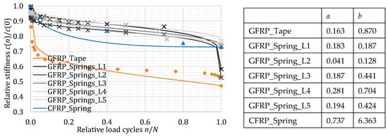 The measured values are plotted as data points. The curves approximated using Equation (1) are shown by the colored lines. Parameters and are compared in the corresponding table. The curves for the GFRP springs (grayscale) are almost identical. A similar decrease in stiffness is observed for the CFRP spring (blue); the qualitatively different curve is due to the small number of data points. For the GFRP tape (orange), the curve is significantly steeper in phase 1, but from phase 2 onwards, it is similar to the GFRP springs. The stress is significantly higher than the spring’s stress and thus explains the earlier damage to the band at the start of the test. The CFRP spring is also highly stressed (CFRP has a lower elongation at break than GFRP). According to literature, for lower stresses, CFRP springs would be expected to lie above the lines of the GFRP springs.
