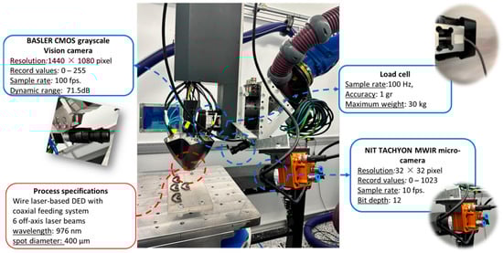 The process monitoring setup comprises a BASLER (Ahrensburg, Germany) Complementary Metal-Oxide-Semiconductor (CMOS) grayscale vision camera (10 fps, 1440 × 1080-pixel resolution, 71.5 dB dynamic range, 0–255 range of values) and an NIT (Madrid, Spain) TACHYON 1024 infrared thermal micro-camera (10 fps, 32 × 32-pixel resolution, 12-bit depth, 0–1023 range of values), which uses a low-pass filter to cut off laser reflections, both retrofitted off-axis. The vision camera is connected via a USB 3.0 port, and a Python PyPylon library (version 4.4.2) is used to acquire real-time images of the melt pool. Apart from the cameras, a side-mount bending beam load-cell embedded in the deposition head by the machine manufacturer was utilized as introduced in [7]. The load-cell logs, the process parameter data, the robot positioning, and the timestamps are synchronized (sampling frequency 10 Hz) and combined into a .csv file by a custom Python-based software to assist in the interpretation of outputs and to keep track of the process history.