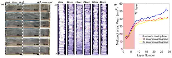 Figure 2a depicts the front view of the built parts created for the first experiment and the positions of the cuts where cross-sectional stability was measured (Figure 2b). Evaluation of width and height reveals deviations, especially in the top layers. This phenomenon is attributed to the constant laser power value used across height, which causes heat to accumulate. Above a critical height, material remelts and flows laterally, leading to local variations in layer height. After measuring cross-sectional width for all samples, this phenomenon was found to be more intense in experiments with cooling times less than 18 s. This indicates that only after a cooling time (deposition + dwell) of 24 s has the part cooled enough to prevent intense surface remelting. Figure 2c presents the mean melt pool area for three indicative cooling times. Until layer 7, values remain consistent across all cases, indicating minor influence of cooling time. Albeit, after layer 10, the mean melt pool area increases. The shorter the cooling time, the more pronounced the increase is. By combining the aforementioned results, the mean melt pool area can be used to assess part quality. To create a geometry-independent threshold for quality evaluation, more complex geometries were created with the same process parameters. The average mean melt pool areas of the three geometries at the critical seventh layer, 23.5 mm2, is defined as the target value, and the threshold where extreme heat is accumulated is set to 30.7 mm2.