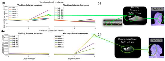 (a) Effect of the SoD deviations on mean melt pool area. (b) Effect of SoD deviations on the load-cell signal. Vision camera frames and cross-section of cases: (c) SoD+1.5 and (d) SoD−1.5.