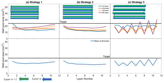 By observing the mean melt pool area per track, oscillatory behavior is detected in the melt pool area of the third strategy. This is attributed to the difference in the sequence of deposition, which results in different heat profiles of the same track number in different layers. Additionally, because the relative position of the camera to the working area remains the same, changes in the sequence of deposition affect the captured camera frames. Even though this behavior is detected also by the mean melt pool area per layer, accurate insights into the process status cannot be drawn, thus highlighting the need for a sophisticated control strategy that relies on the study of each track separately. In the case that the sequence of depositing the tracks in each layer is inverted, the control strategy should consider the mean value of every two layers, addressing any uncertainties linked with the clarity of information captured by the camera.