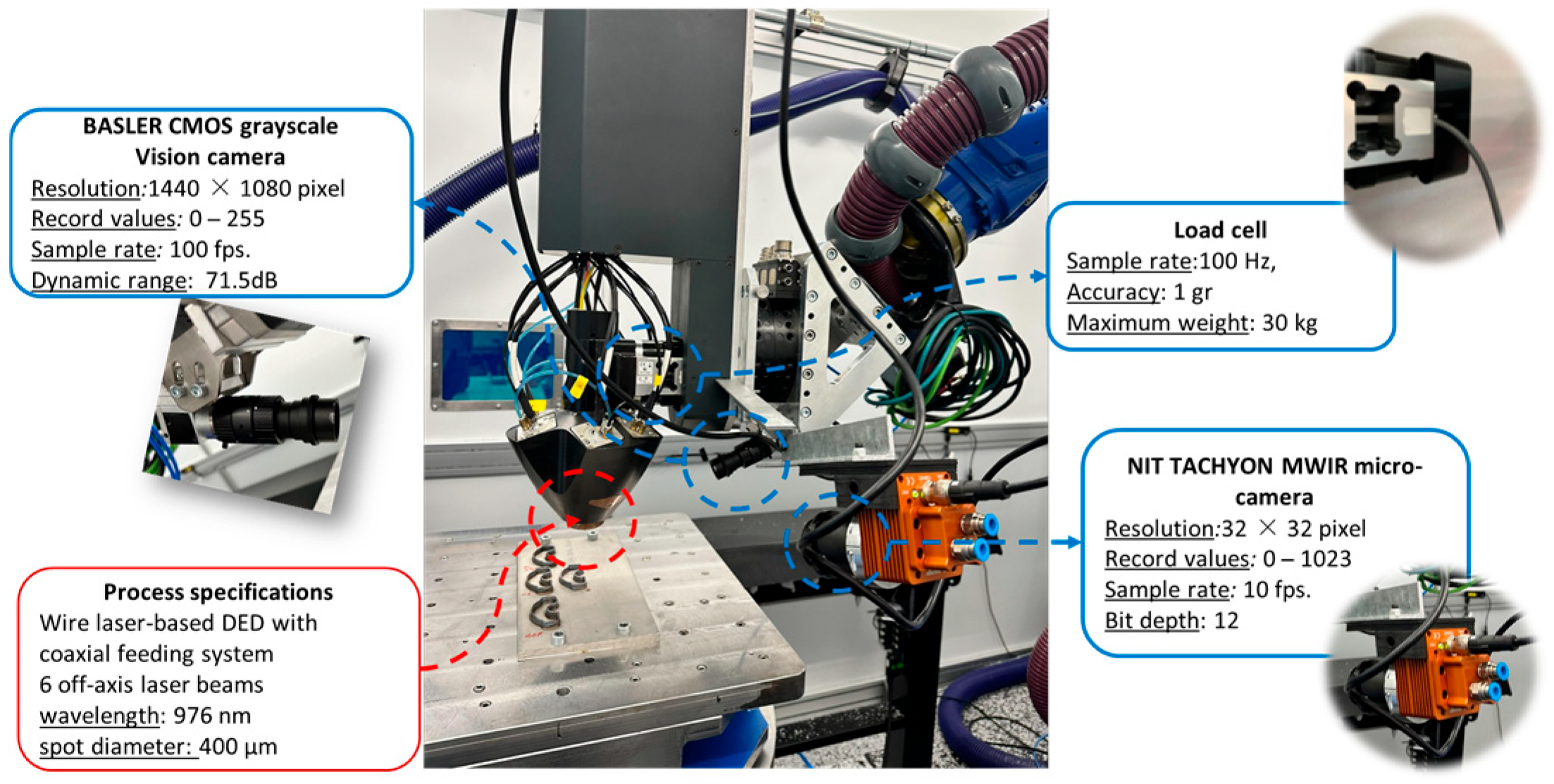 The process monitoring setup comprises a BASLER (Ahrensburg, Germany) Complementary Metal-Oxide-Semiconductor (CMOS) grayscale vision camera (10 fps, 1440 × 1080-pixel resolution, 71.5 dB dynamic range, 0–255 range of values) and an NIT (Madrid, Spain) TACHYON 1024 infrared thermal micro-camera (10 fps, 32 × 32-pixel resolution, 12-bit depth, 0–1023 range of values), which uses a low-pass filter to cut off laser reflections, both retrofitted off-axis. The vision camera is connected via a USB 3.0 port, and a Python PyPylon library (version 4.4.2) is used to acquire real-time images of the melt pool. Apart from the cameras, a side-mount bending beam load-cell embedded in the deposition head by the machine manufacturer was utilized as introduced in [