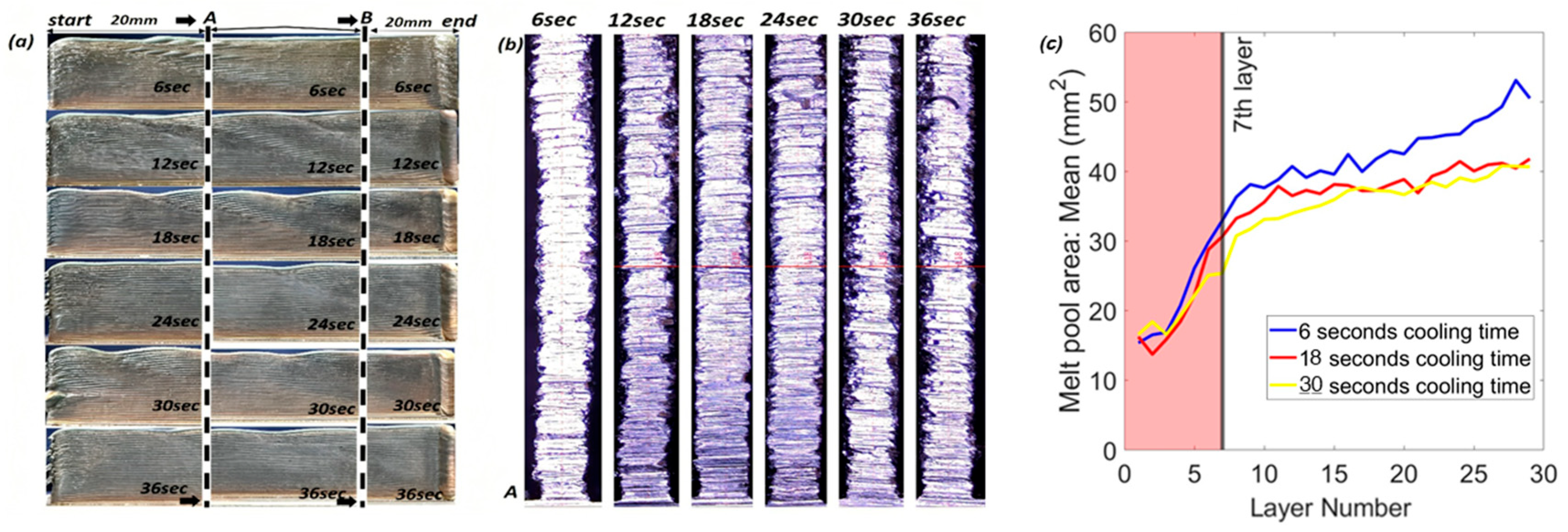Figure 2b). Evaluation of width and height reveals deviations, especially in the top layers. This phenomenon is attributed to the constant laser power value used across height, which causes heat to accumulate. Above a critical height, material remelts and flows laterally, leading to local variations in layer height. After measuring cross-sectional width for all samples, this phenomenon was found to be more intense in experiments with cooling times less than 18 s. This indicates that only after a cooling time (deposition + dwell) of 24 s has the part cooled enough to prevent intense surface remelting.