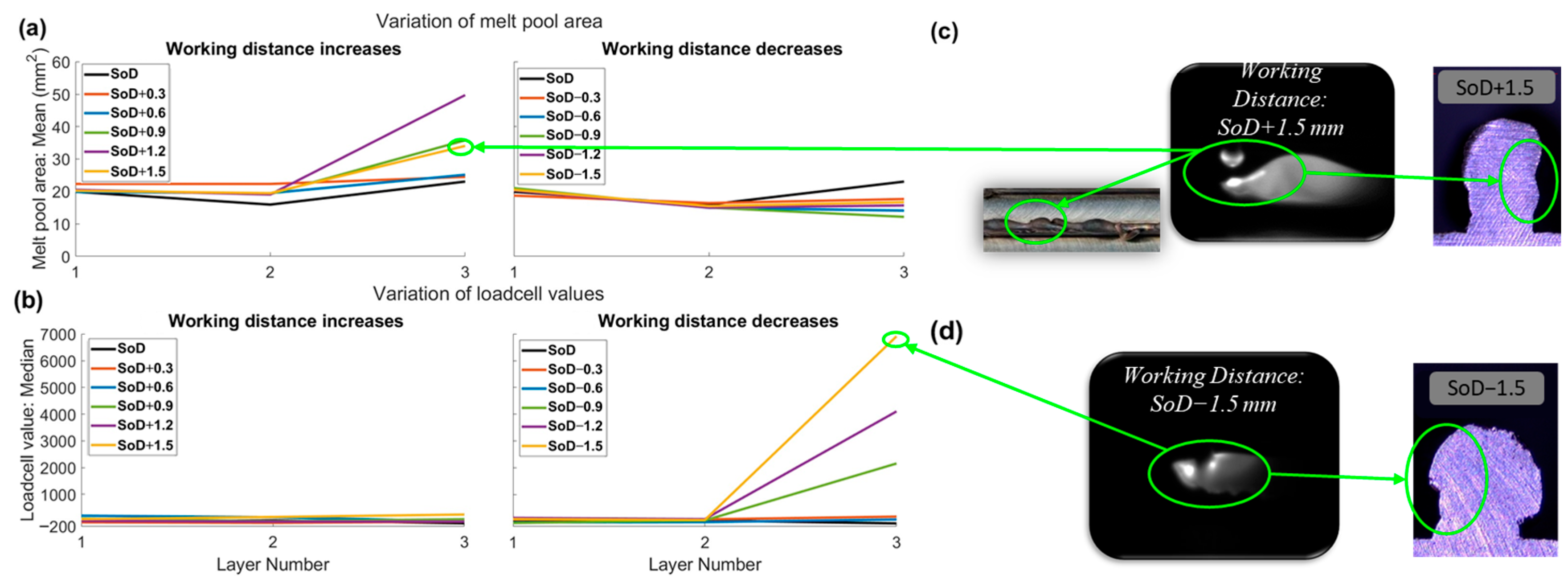 Figure 3b shows the corresponding load-cell signals. Additionally, some critical frames of the melt pool and images of the cross-section of the final parts with the largest SoD deviations are depicted in
