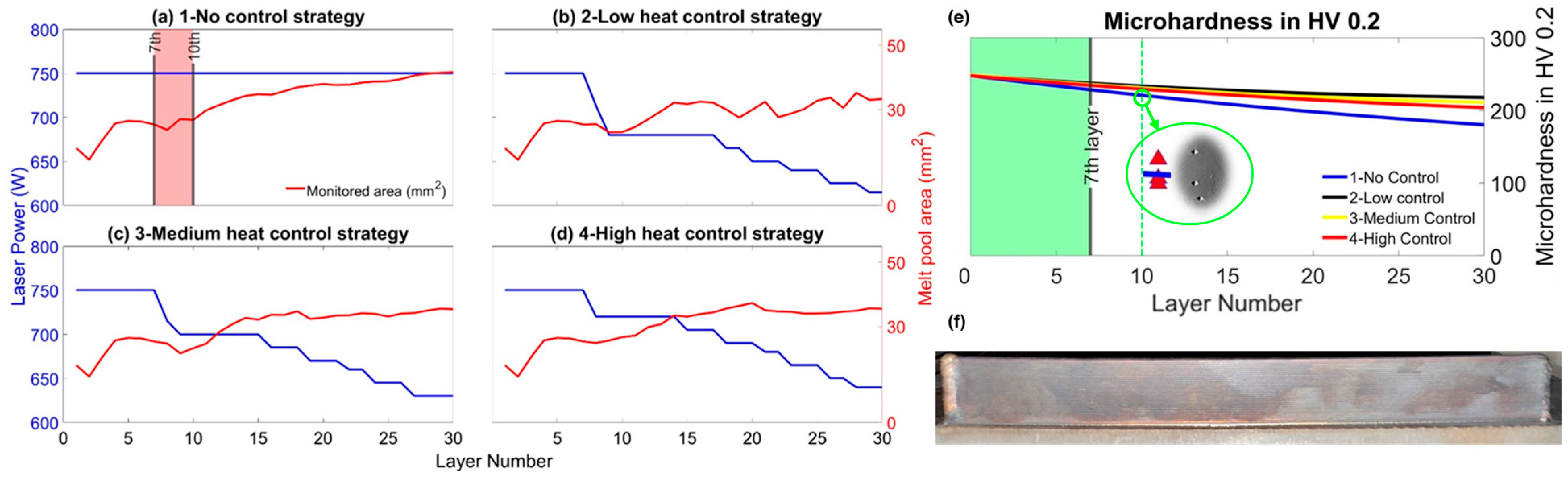 2. These outputs demonstrated the effect of laser power control on the bead width across the part height and validated the conjunction between the mean melt pool area and the bead thickness. Microhardness results indicated a drop proportional to the decrease in the cooling rate [