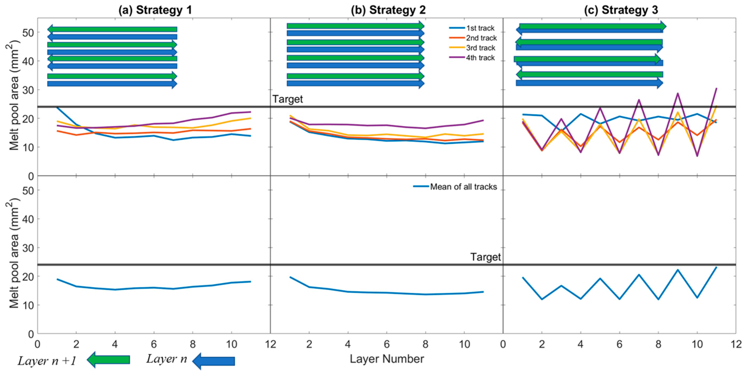 Figure 5 shows the mean melt pool area per track and the mean melt pool area per layer for three variations in infill strategies. For the first strategy, each track is deposited in the opposite direction of the previous one, while for the second strategy, all tracks have the same direction. To study the effect of the track sequence, the third strategy was designed whereby the sequence of tracks is inverted every two layers. Four tracks are deposited in each layer.
