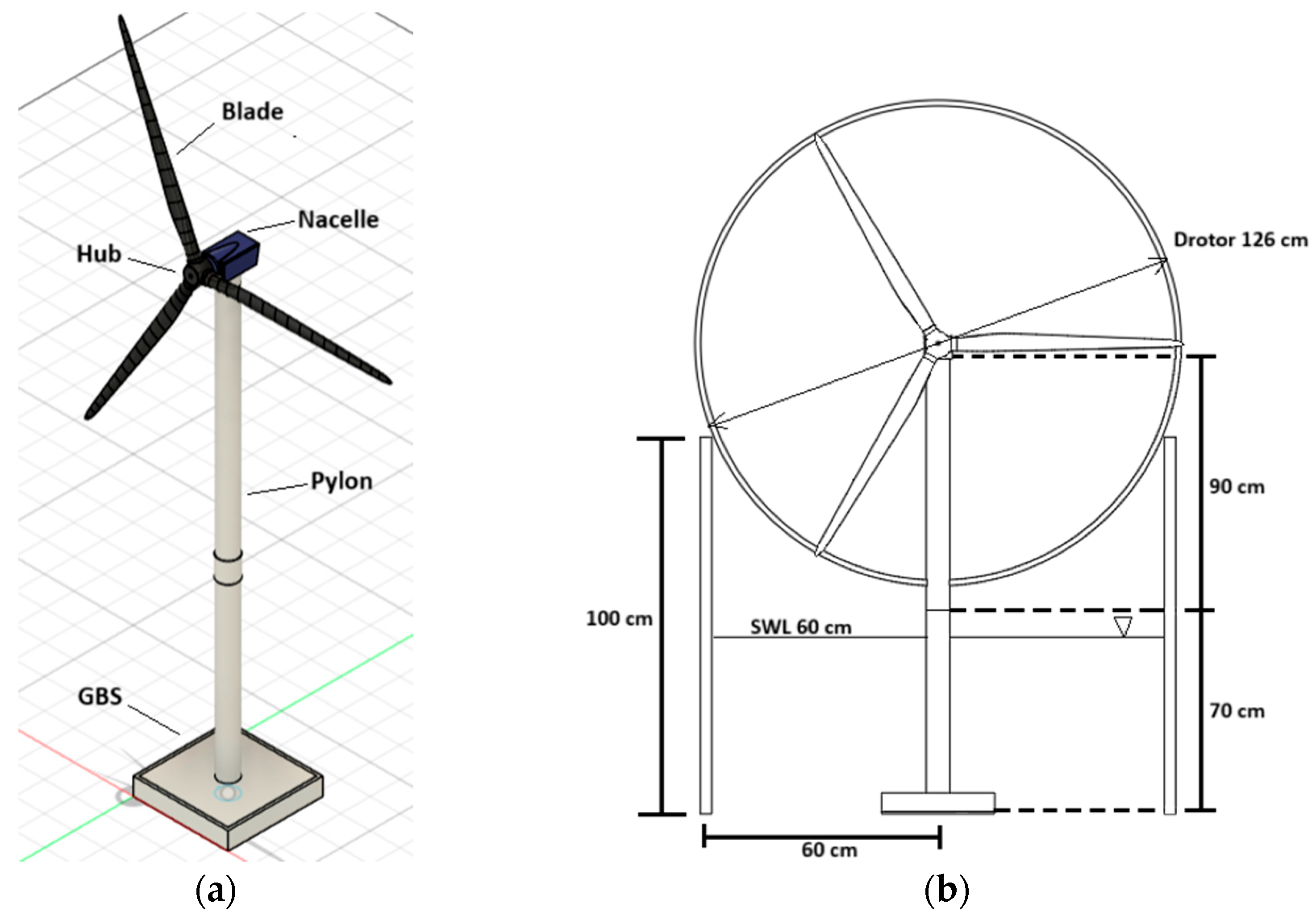 Figure 1. (a) Three-dimensional representation of the scale 5MW NREL WT; (b) front view of the scale model with the wave basin (all dimensions are given in cm).
