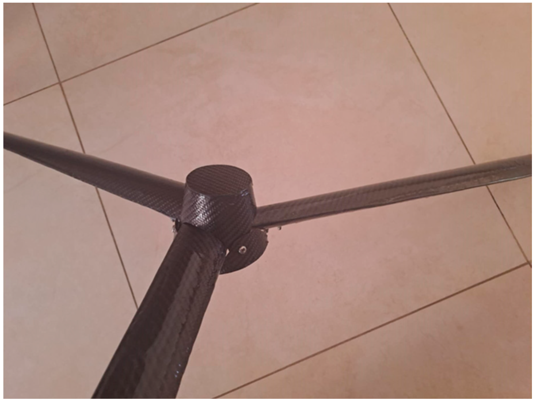Furthermore, due to the necessity for high mechanical strength and low weight, the hub of the wind turbine model was also fabricated using CFRP. For the fabrication of the hub, a manual lay-up process was employed. As before, three layers of carbon fiber, infused with epoxy resin, were carefully applied over a conical shape mold ensuring a proper wind flow and an appropriate aerodynamic response of the turbine system. The final construction of the blades and the hub is illustrated in Figure 2.