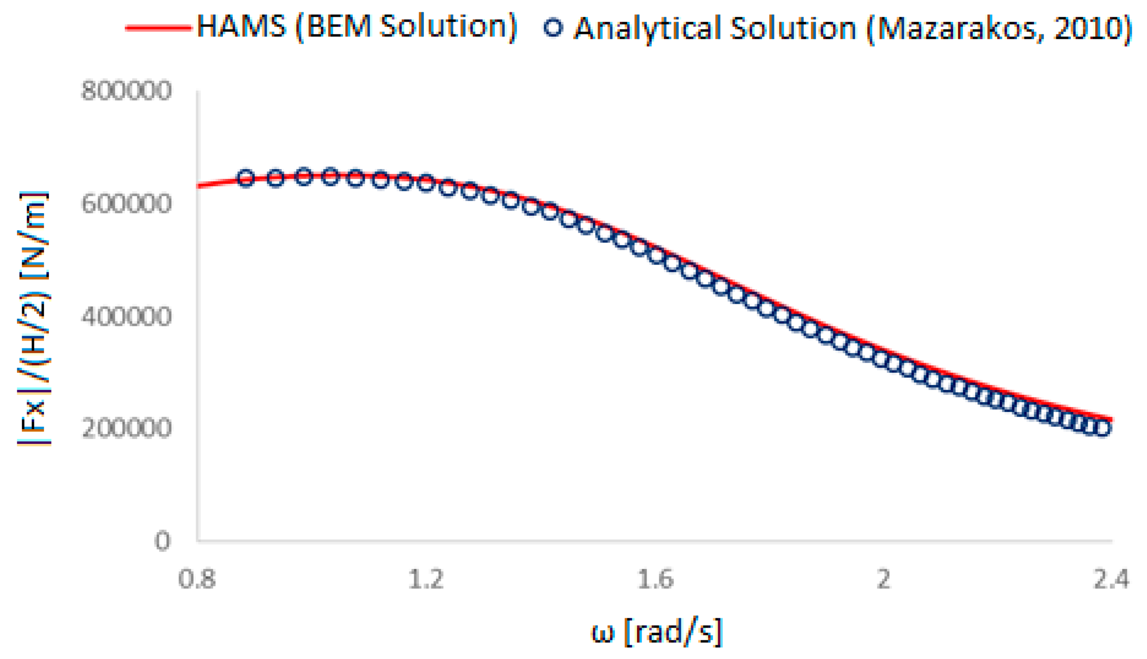 As can be seen in Figure 7 [6], the results of the HAMS program are very close to those obtained from the analytical solution. In the diagram, we observe that the largest value of the horizontal force modulus is presented for ω = 0.9 rad/s.