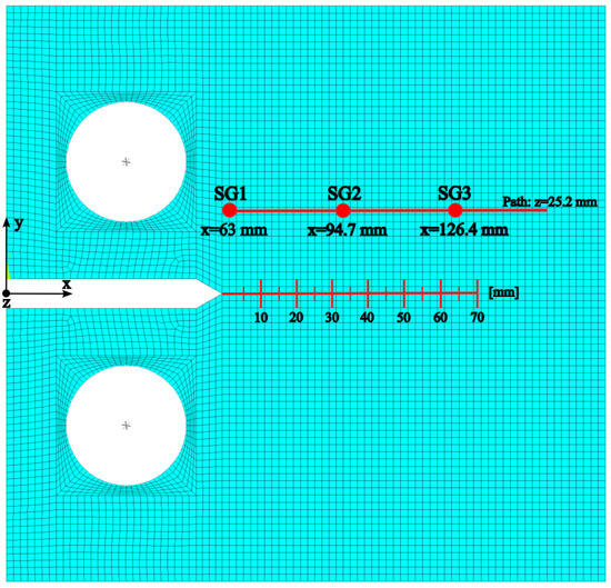 Finite Element (FE) model of the Compact Tension specimen (CT), illustrating the positions of the simulated strain gauges (SG1, SG2 and SG3). The red scale, starting from the notch tip, defines the predicted crack propagation path along the x direction.
