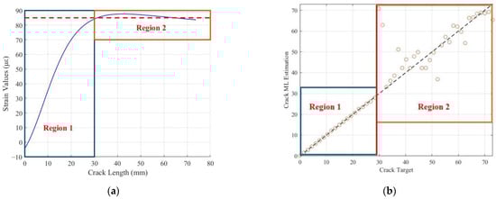 Response of strain gauge 1 in the y-direction (Its specified location and direction is shown in Figure 1): (a) FE-model predictions of strain values as a function of crack length, showcasing two regions. Region 1 (0–30 mm) exhibits linear behaviour, while Region 2 (>30 mm) a non-linear one. (b) Comparison between the target crack length and the corresponding Maximum Likelihood Estimations (MLE). Region 1 demonstrates high accuracy with estimates closely on the ideal line (y = x), while in region 2 increased deviation from the ideal line reflects reduced prediction accuracy. Each circular marker presents an individual data point comparing the maximum likelihood estimate against the target crack length value. The dashed line represents the ideal prediction line (y = x), indicating the perfect agreement.