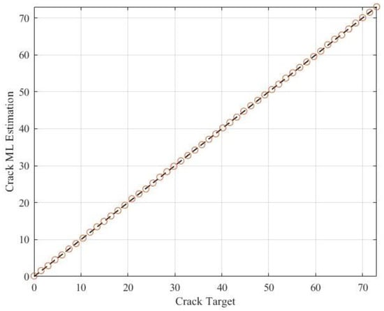 To visualize the results of the maximum likelihood estimates, each estimate is plotted against its corresponding target crack length along with a 45° reference line (y = x) to assess agreement. Points that lie on the reference line indicate perfect agreement, while increasing deviation from the line reflects decreasing accuracy.
