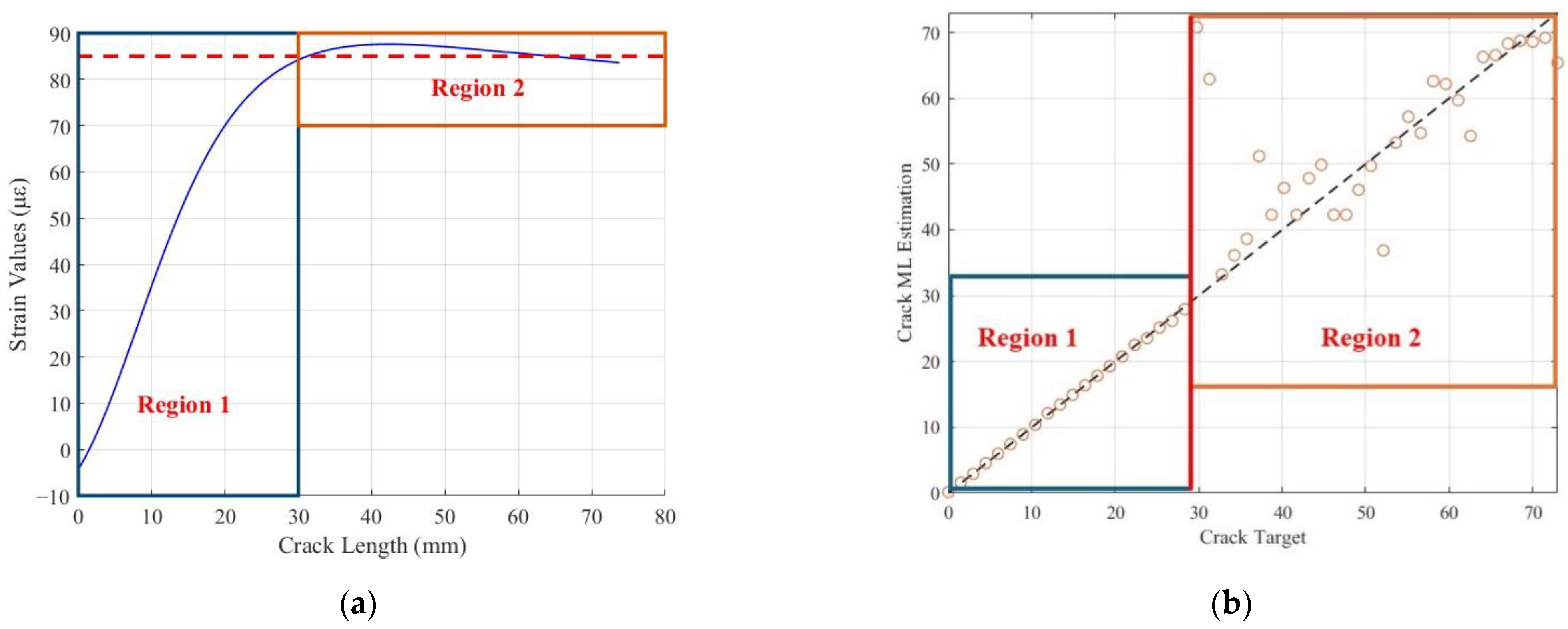 Figure 2a, indicate that when the crack propagates close to the location of the strain gauge, where it showcases higher sensitivity, the strain values exhibit a monotonic, one-to-one relationship with crack length, as illustrated in region 1 of
