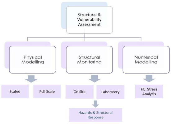 Structural and vulnerability assessment in geotechnical engineering is commonly approached through numerical/computational modeling, structural monitoring, and physical modeling. Numerical analyses, often based on the finite element method, allow for the prediction of stress–strain behavior under a wide range of loading scenarios. Structural monitoring, performed either on site or in laboratory conditions, provides direct measurements of system performance. Physical modeling, carried out at reduced or full scales, enables the controlled investigation of soil–structure interaction mechanisms under defined boundary conditions. As presented in Figure 1, these approaches can provide complementary insights that improve the reliability of hazard evaluation and structural response prediction. The integration of methods enhances both research outcomes and practical decision-making in geotechnical engineering.