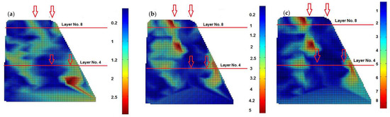 Strain distributions from GeoPIV at g-levels 5 (a), 25 (b), and 50 (c), with red vectors indicating sensor positions.