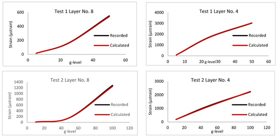 Figure 4 also presents a comparison of recorded and calculated FBG strains, validating the empirical correlations. It should be noted that FBG strain is not determined solely by the gravitational acceleration g. Both equations incorporate the term GeoPIVavg, indicating that the predicted strain also depends on the average GeoPIV value, which varies between experiments even at the same g-level, due to the different centrifuge loading scheme. In addition, variations are noted between Layer No. 4 and Layer No. 8, reflecting differences in mechanical behavior associated with sensor depth.