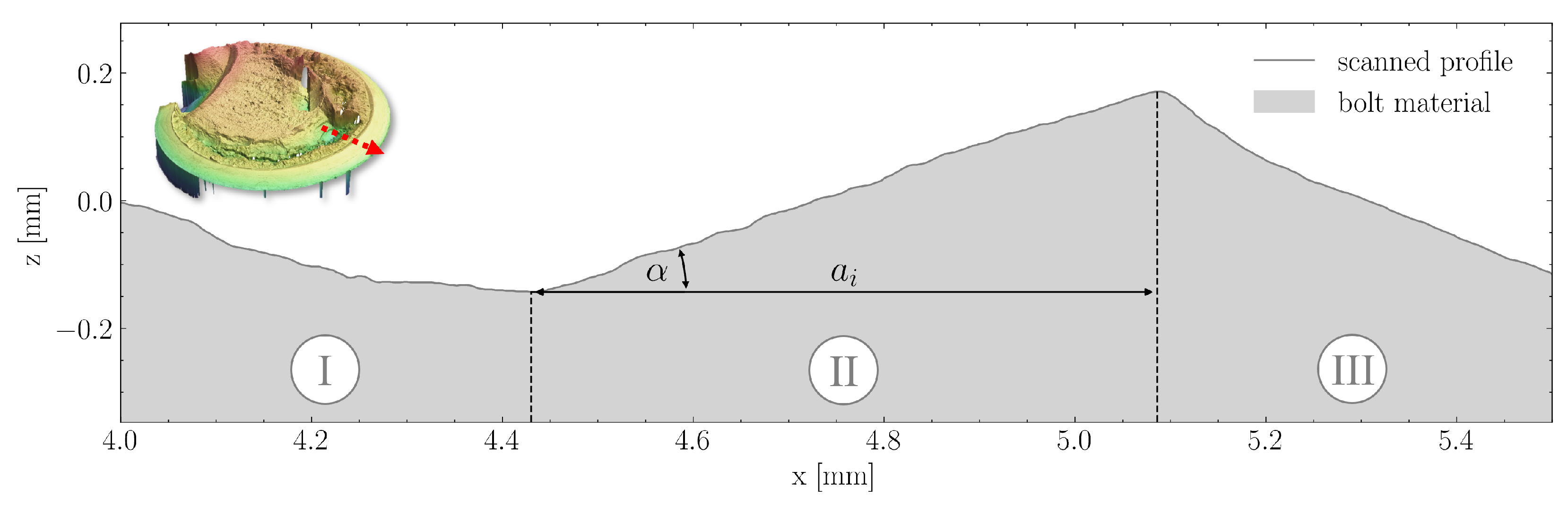 - Requirement 1: Destructive tests must ensure that the failure occurs in the plane of the original fatigue crack (root of the first load bearing thread) to allow access for an optical crack size measurement;