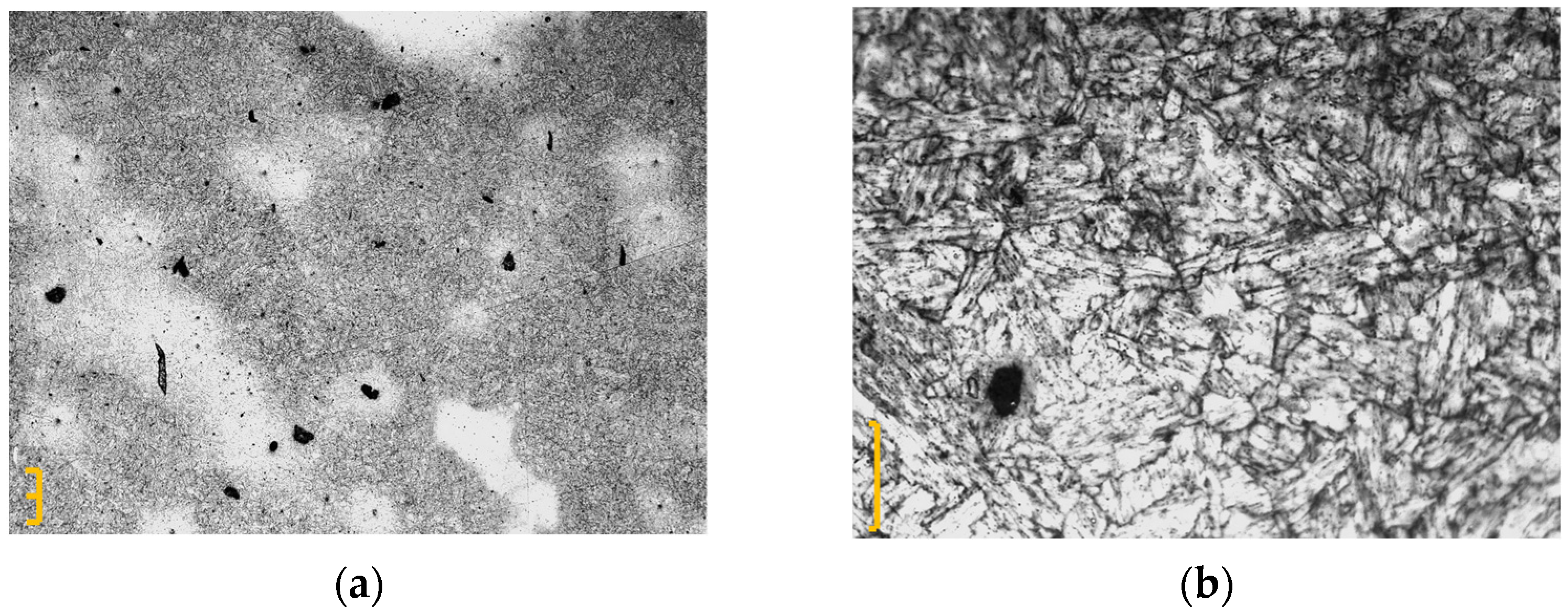 Figure 3a,b) indicated the presence of martensitic structures and an abundance of pores, confirming the effect of the heat treatment on the material’s microstructure. Microstructural characteristics of AM maraging steel, including melt pools, porosity, and the effects of heat treatment, are observed in [
