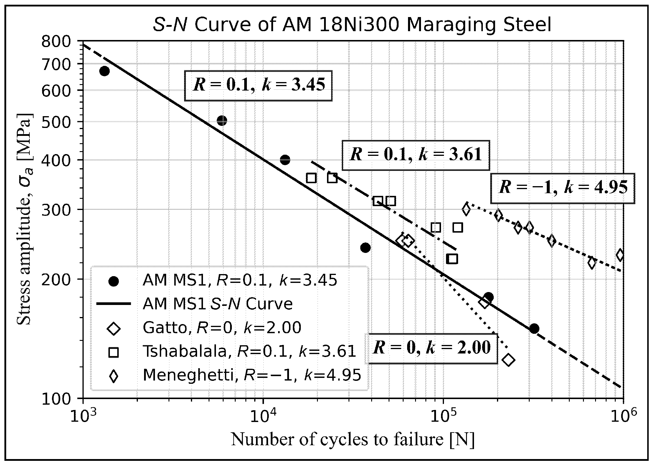 k-value of 4.95. These comparisons underscore the significant influence of heat treatment parameters, build conditions, and stress ratio on the fatigue performance of AM 18Ni300 maraging steel, and highlight the need for standardized testing and reporting to facilitate direct comparisons.