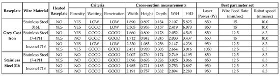 Due to the absence of documentation on multi-material AM in wire DED-LB and complex-to-model thermodynamic phenomena, the selection of process parameters is based on successful parameter sets of SS316 wire and substrate and they are adjusted based on the thermal properties of the material that is used as feedstock and base. The investigated thermal properties are the liquidus temperature, thermal conductivity, specific heat capacity, thermal diffusivity and coefficient of thermal expansion. For each combination, the energy input and the linear energy density are adjusted based on the effect of these properties on heat absorption as it is documented in the literature [20]. As an example, if the liquidus temperature, specific heat capacity and thermal diffusivity of the investigated material exceed those of SS316, the linear energy density (more heat input over a specified length) should also be increased, while if the thermal conductivity is increased, the energy density should be reduced (less heat input over a specified length). Preheating is mandatory in the case of depositing on metals with high thermal expansion coefficients or in metals that are susceptible to cold cracking (e.g., GCI). Conversely, the hot cracking cannot be avoided with pre-heating since it is directly linked to the material chemical composition. Preheating the substrate is also beneficial in reducing porosity and cold cracking, as it reduces residual stresses [20]. Reflectivity can also influence the heat input. A more reflective surface requires higher energy density to achieve the same effect as a less reflective surface. The reflectivity of SS316 is noticeably higher than gray cast iron; thus, decreased energy density is required when using the latter.