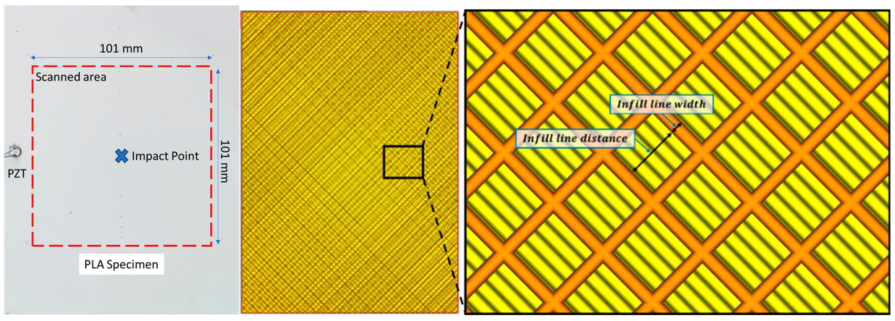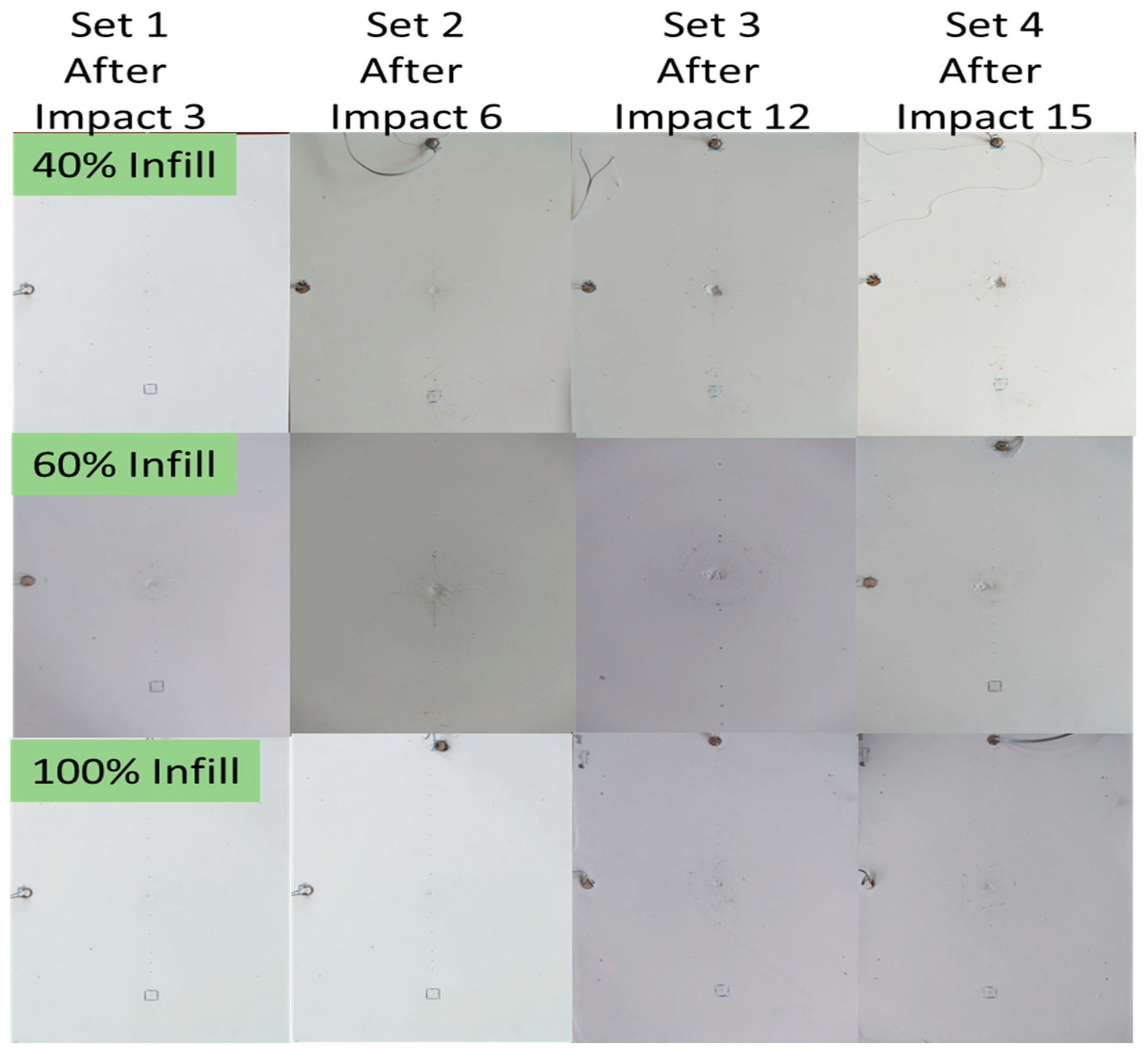 Figure 3, the extent of physical damage varies considerably across specimens with different infill densities, despite being subjected to the same impact energy. This variation is also reflected in the full-field SLDV data.
