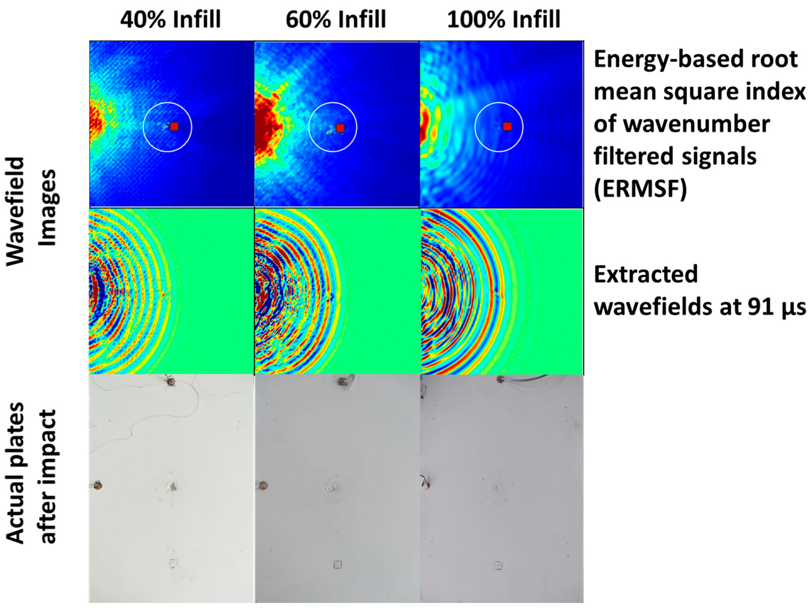 Given that Stage 4 of impact loading resulted in the most significant damage across all PLA specimens, wavefield visualizations and corresponding waveform patterns at approximately 91 µs (the time when the guided wavefront approaches the impact site) are presented in
