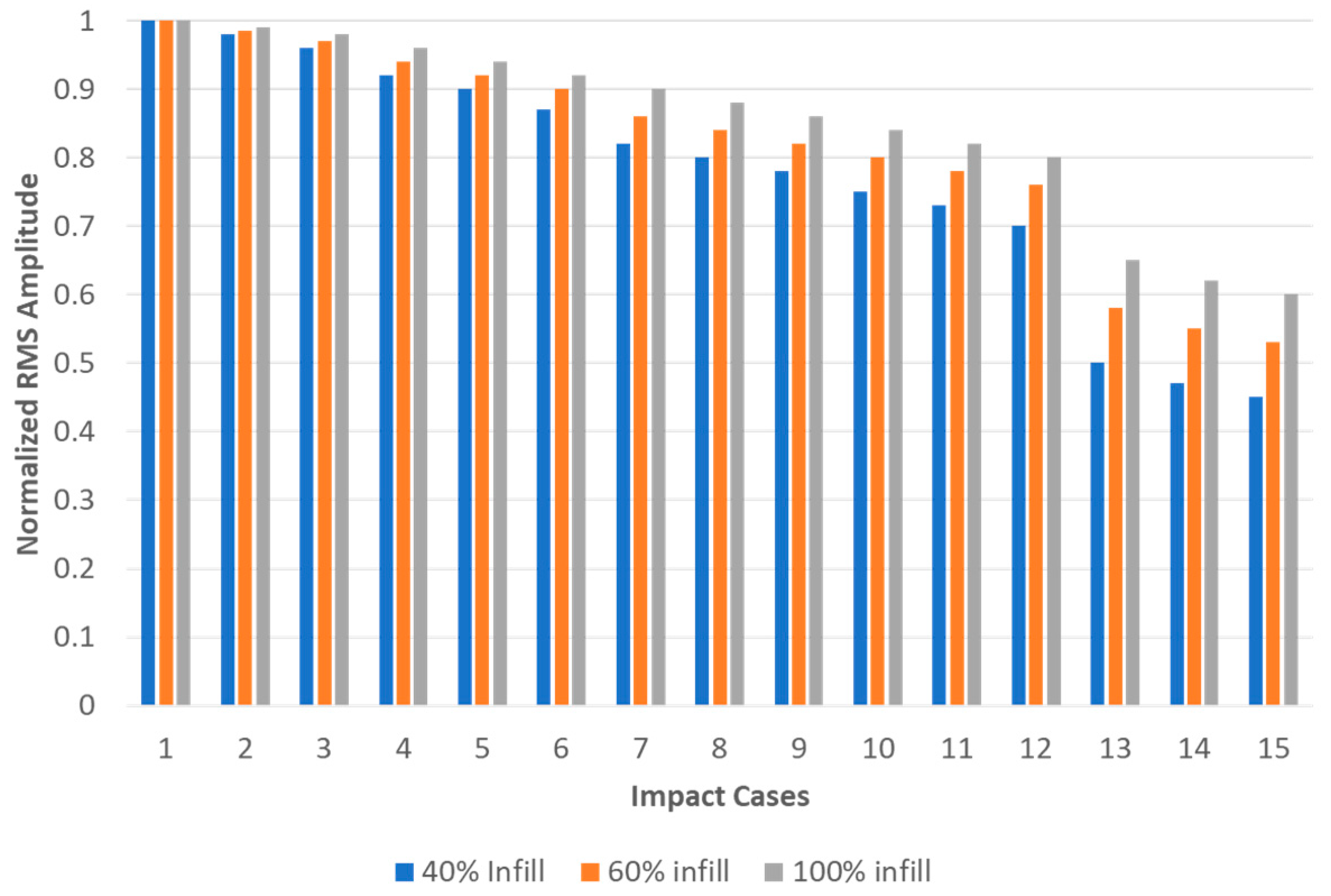 Figure 4). The 40% infill specimen exhibits a steep reduction, with the normalized amplitude dropping to 45% of its initial value by Impact 15, as shown in