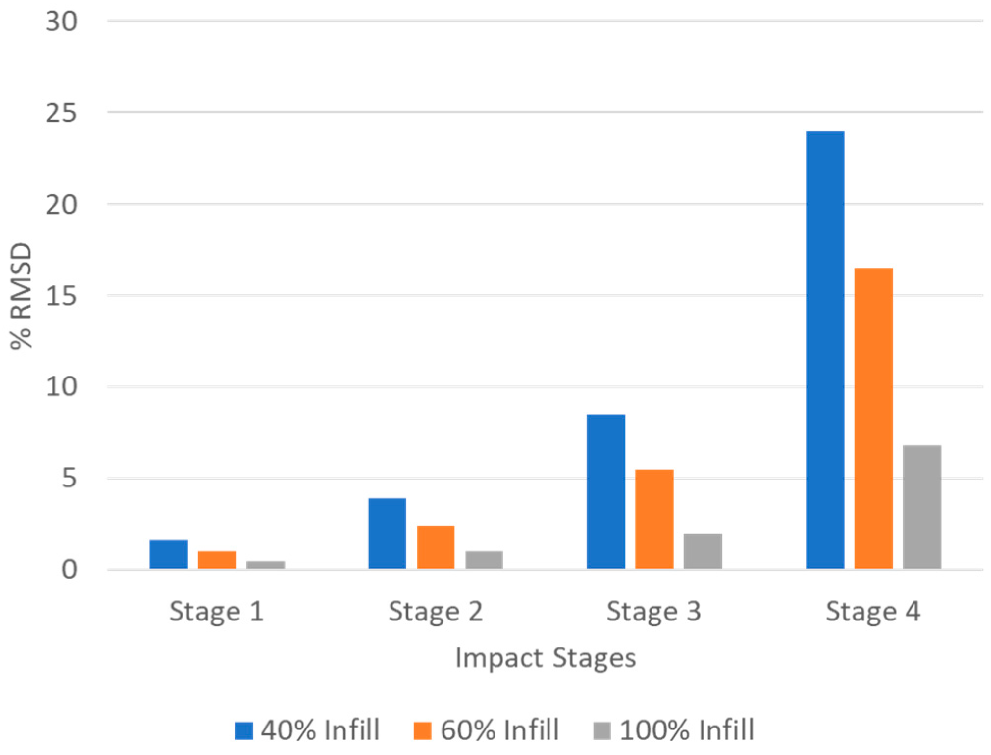 The RMSD computed from EMI conductance signatures further supports the wave-based observations. The RMSD values increase monotonically with impact severity across all infill levels, but with markedly different magnitudes. The 40% infill specimen shows an RMSD of 24% at Stage 4, indicating substantial deviation from the baseline, driven by global stiffness reduction and altered boundary conditions caused by progressive internal failure, as shown in