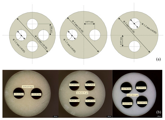 The bars were manufactured in two configurations, containing either two holes or four holes along their length. The outer diameter was measured using a caliper to determine the cross-sectional area, and for improved measurement accuracy, a Leica DM6M microscope (Leica Microsystems GmbH, Wetzlar, Germany) was employed (Figure 2). The specimens were subsequently cut to the required test dimensions of 180 mm and 80 mm using an abrasive strip.