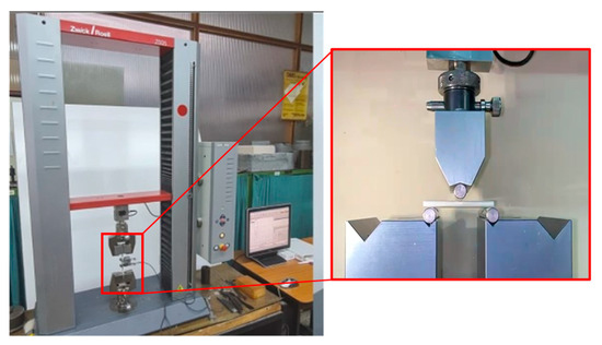All tests were carried out using a Zwick universal testing machine (Zwick Roell Group, Ulm, Germany) equipped with a 5 kN load cell. The crosshead speed was maintained at 2 mm/min throughout the experiments (Figure 3).