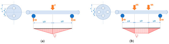 For the 3PB test, the support span length was set to 50 mm, with the force applied symmetrically at the midpoint between the supports. For the 4PB test, the support span length was 80 mm, and the total load was divided into two equal forces applied symmetrically, with a distance of 40 mm between the points of load application, Figure 4.