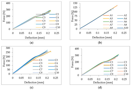 Force–deflection curves obtained for (a) 99% pure alumina ceramic, (b) 95% pure alumina ceramic, (c) 99% pure alumina ceramic with vertically aligned holes, and (d) 99% pure alumina ceramic with horizontally aligned holes.